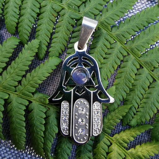 Edelstahlanhänger "Hand der Fatima" mit Glitzersteinen und blauem Glasstein besetzt. Größe ca. 32x21x4 mm Die Hand der Fatima symbolisiert die schü...